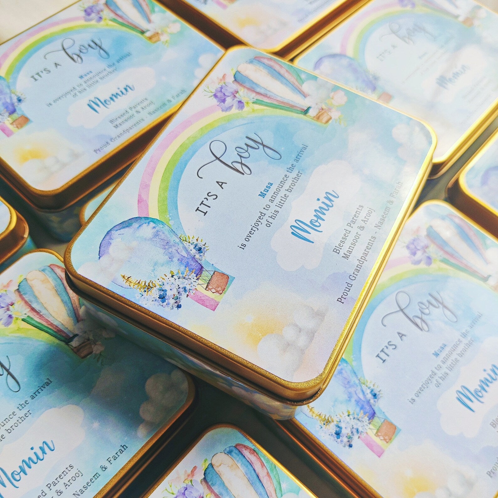 Announce your little prince’s arrival in style with our It’s a Boy Celebration Tin Box — a dreamy keepsake wrapped in soft sky-blue and rainbow tones. Crafted from premium tin, it’s perfect for baby announcements, aqeeqah favors, or newborn celebrations.