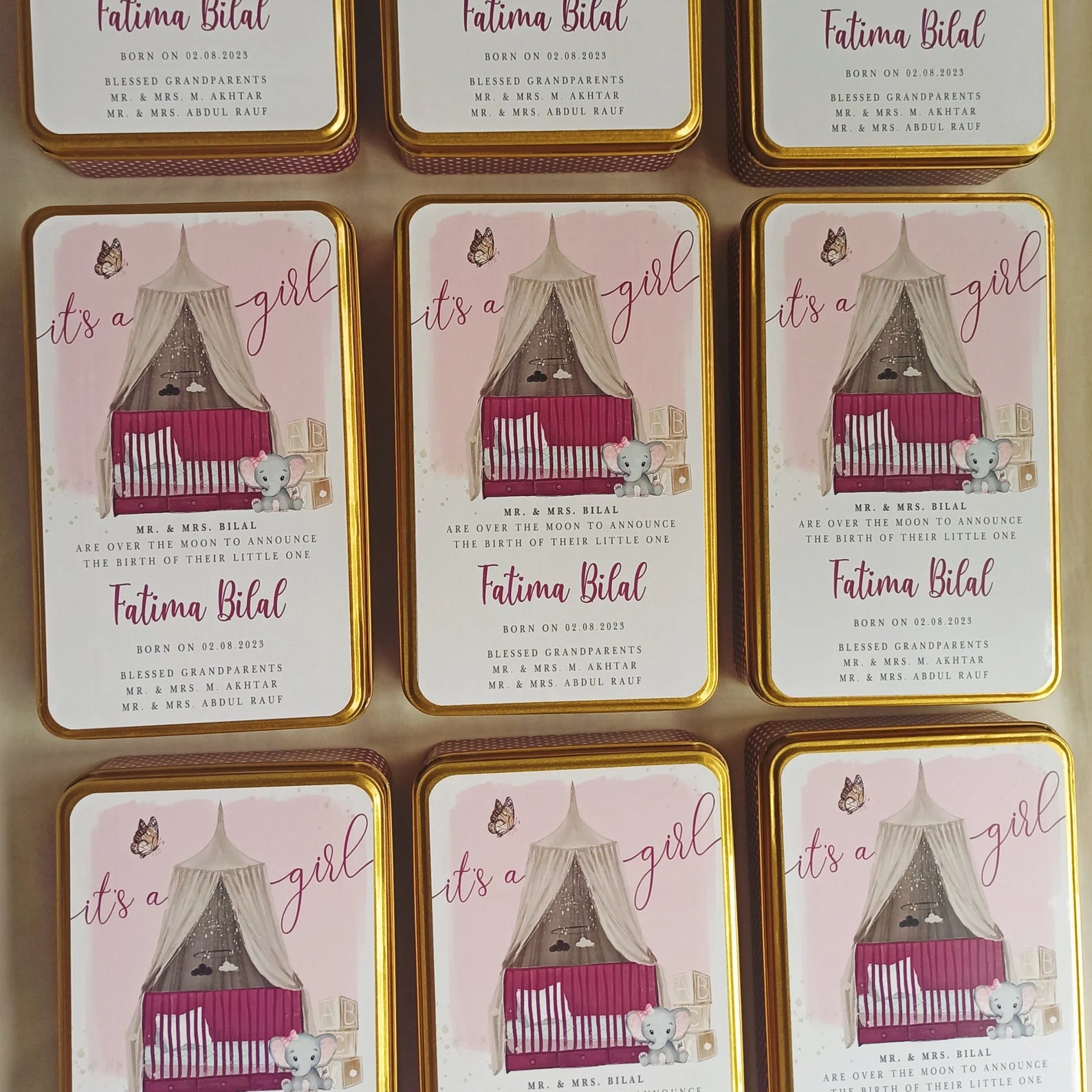 Welcome your precious princess with our It’s a Girl Celebration Tin Box, designed in soft blush tones with a whimsical pastel theme. Made from high-quality tin, it’s perfect for baby showers, aqeeqah giveaways, or newborn announcements.